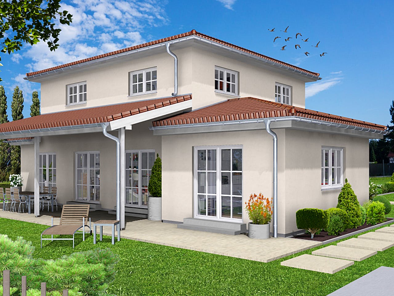 Mediterranes Flair für ein entspanntes Leben. Durch den gegliederten Baukörper mit 2-stöckigem Zentrum, einer schattenspendenden Terrassenüberdachung und die Farbgestaltung in warmen Tönen erhält dieser Hausentwurf seine südländische Anmutung.