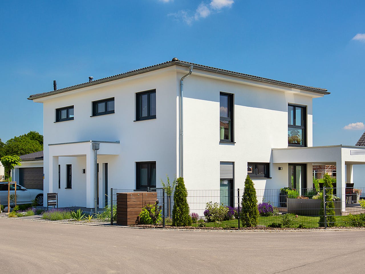 Für dieses Einfamilienhaus mit einer Grundfläche von etwa 105 m² empfehlen wir ein Grundstück ab circa 450 m². Wir kalkulieren dabei zusätzlich 50 m² für Stellplätze ein. Die restliche Fläche bietet ausreichend Platz für einen Garten und die nötigen Grenzabstände, damit die Architektur der Stadtvilla optimal zur Geltung kommen kann.